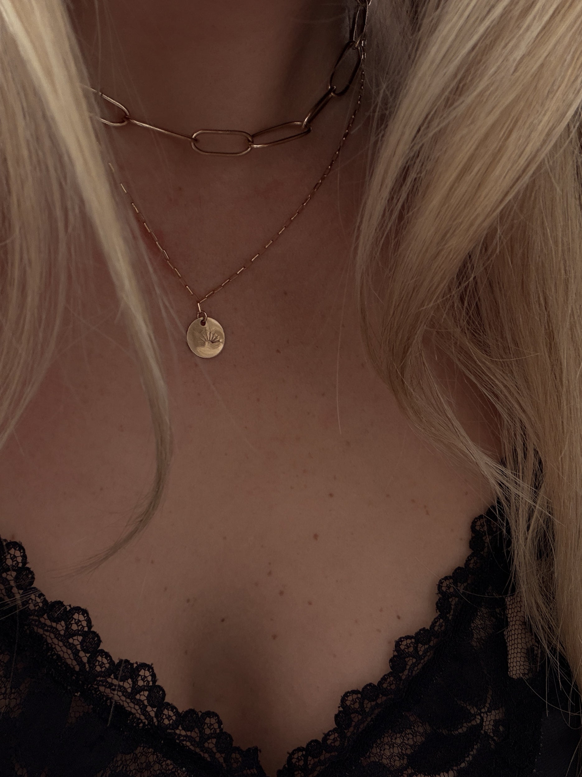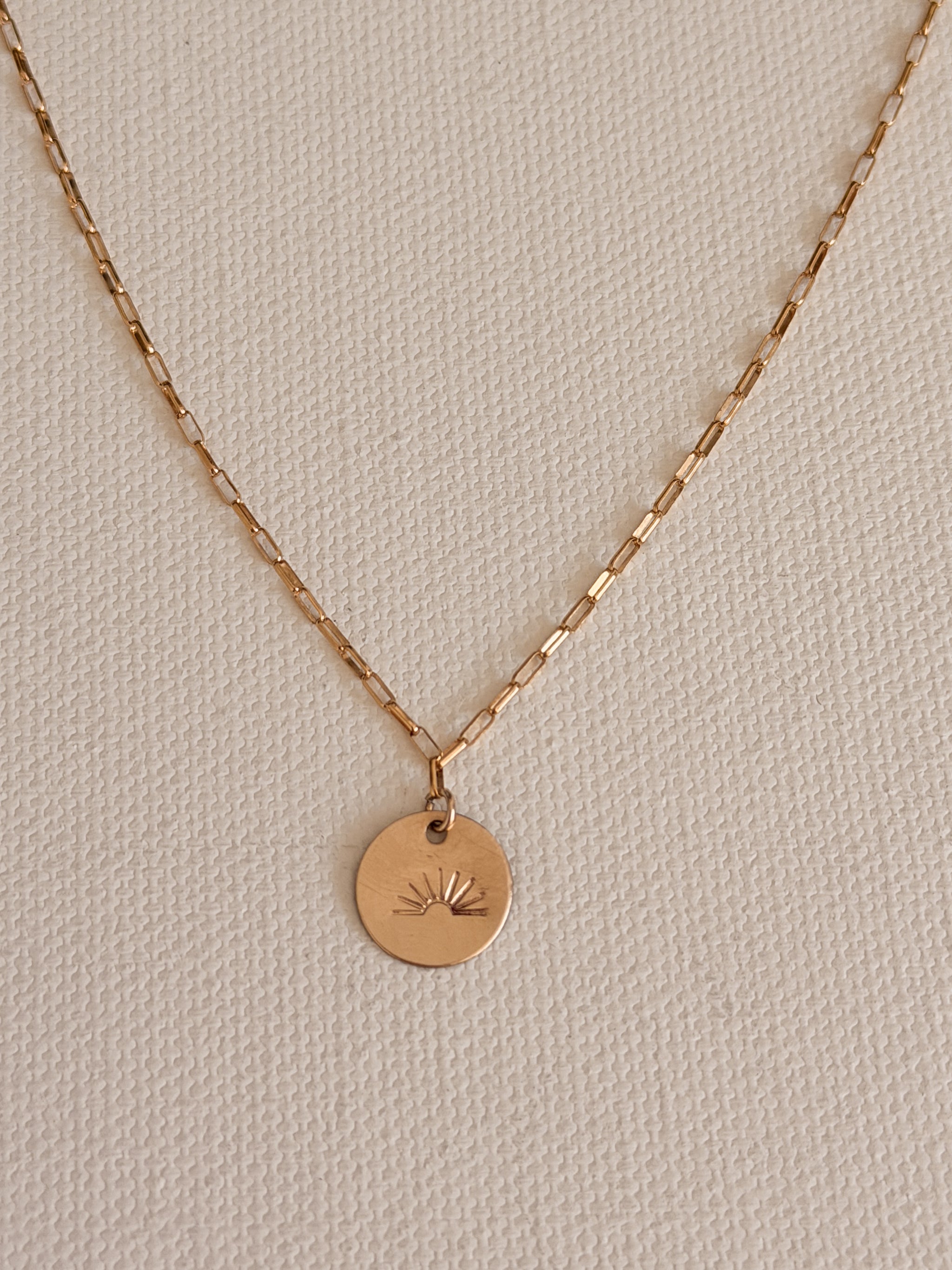 - hand formed stamped sun ray coin on rectangle link chain