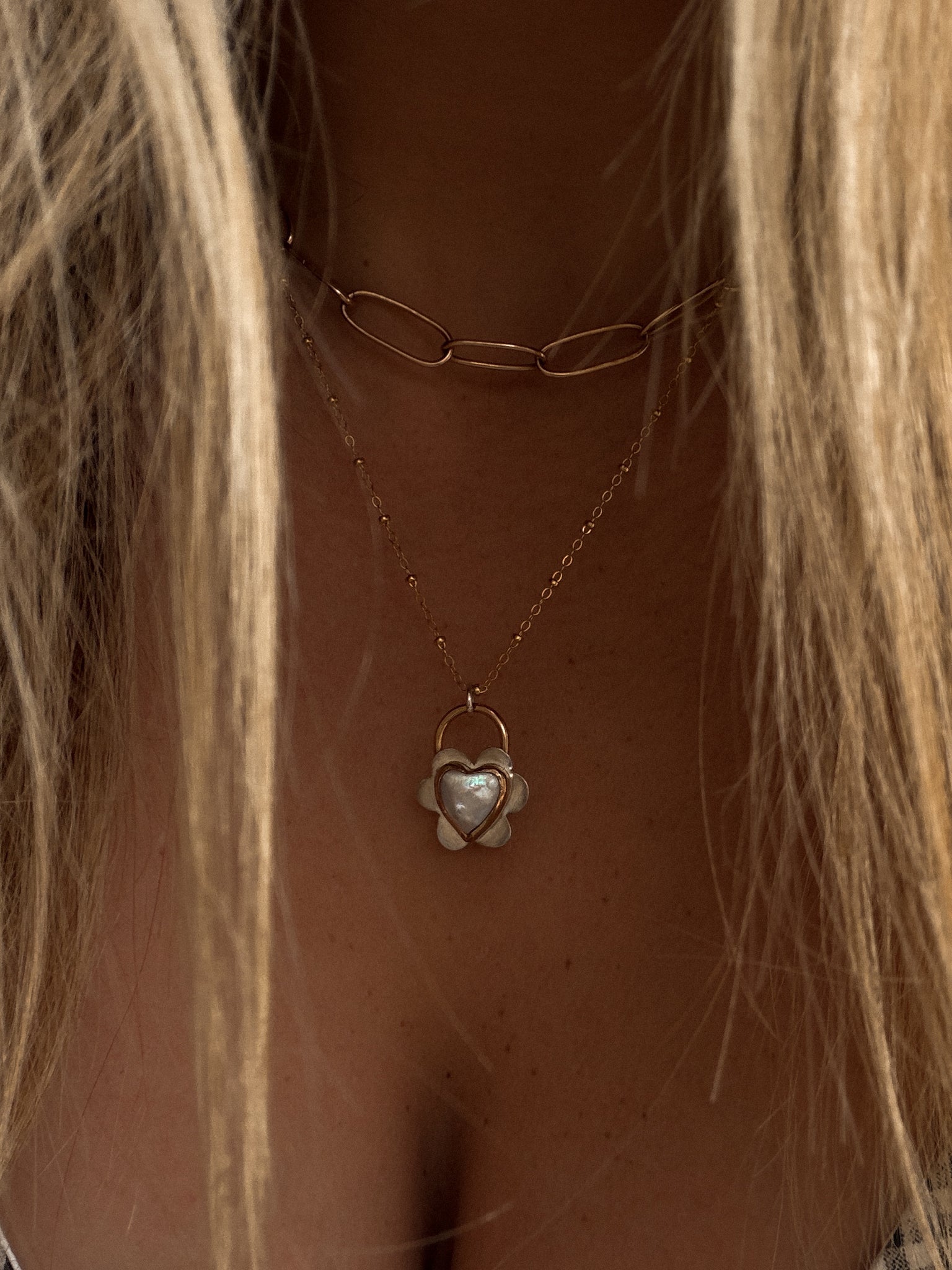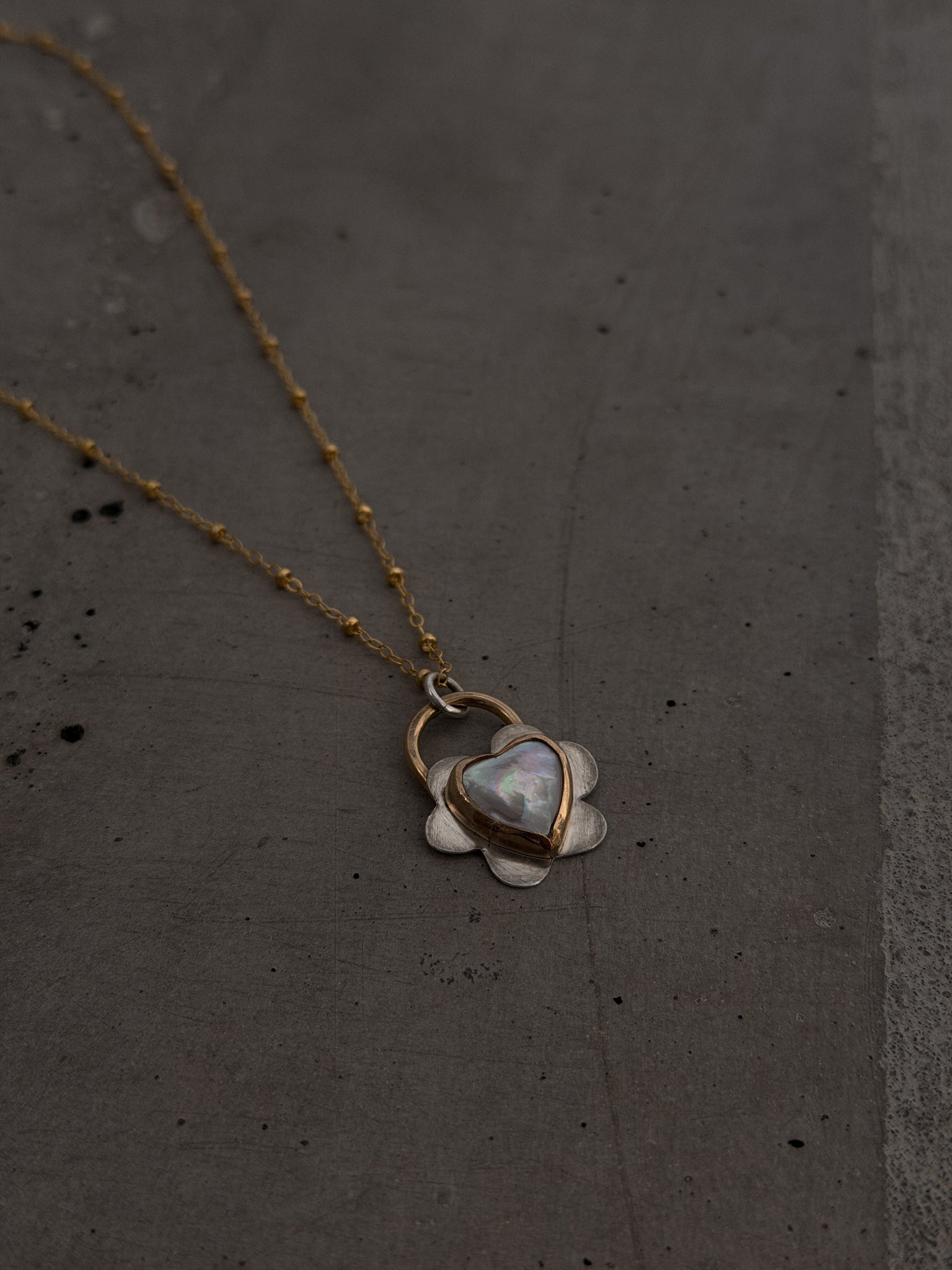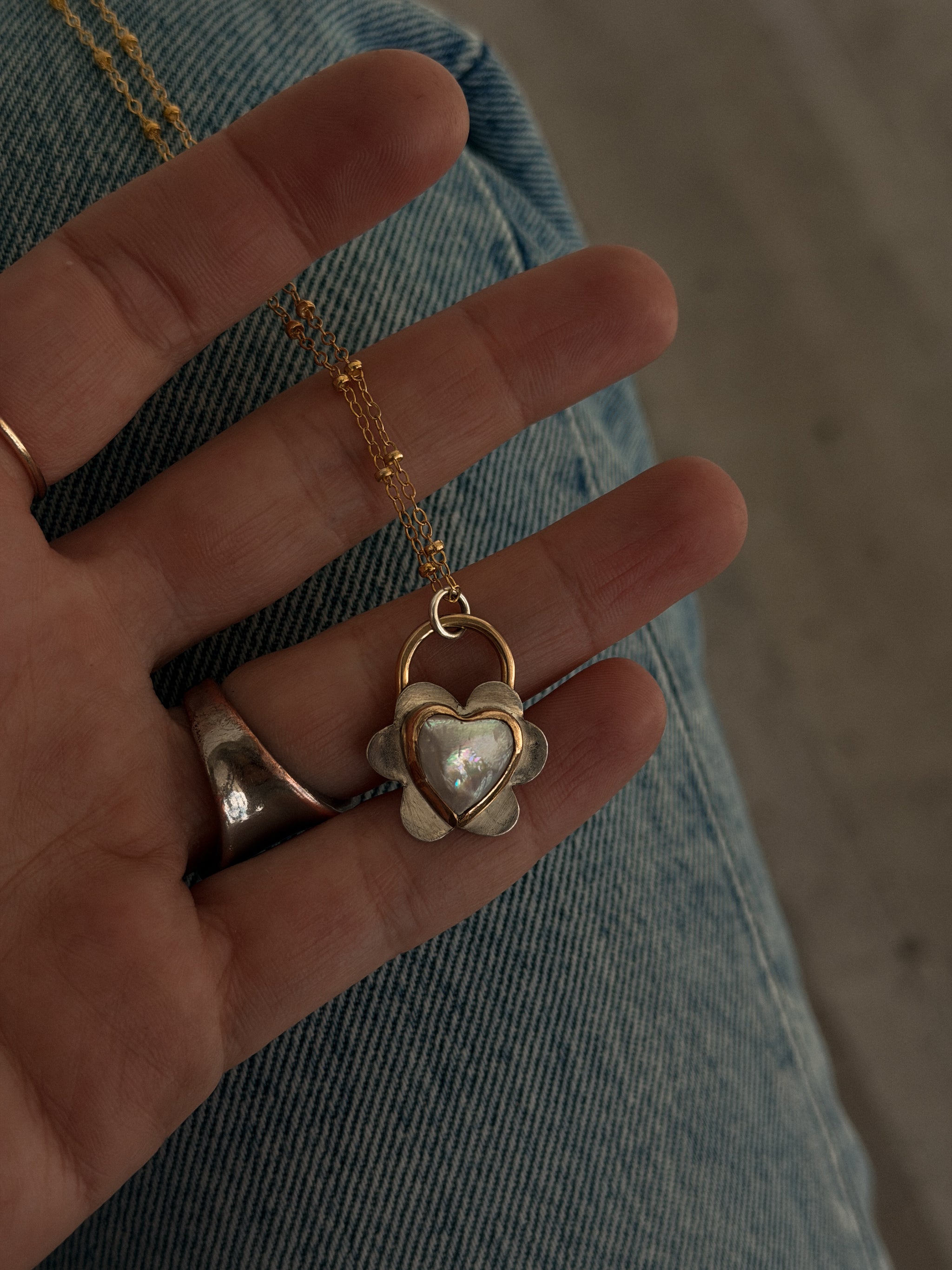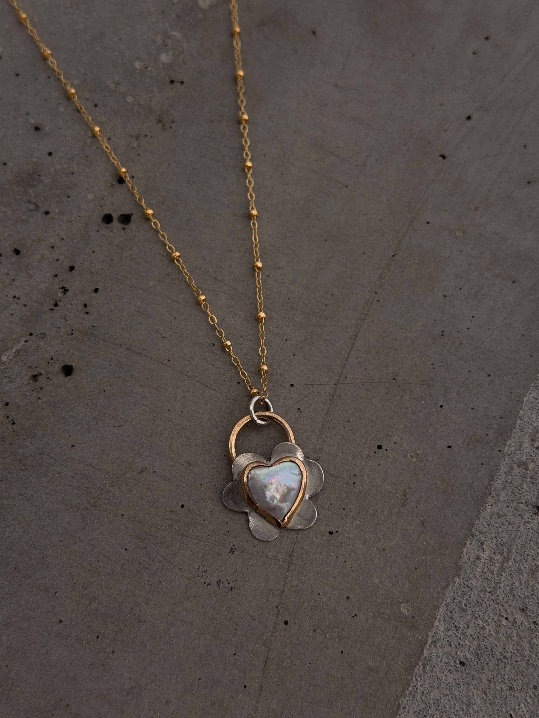 - 14k gold fill hand formed around genuine pearl heart on sterling silver sheet