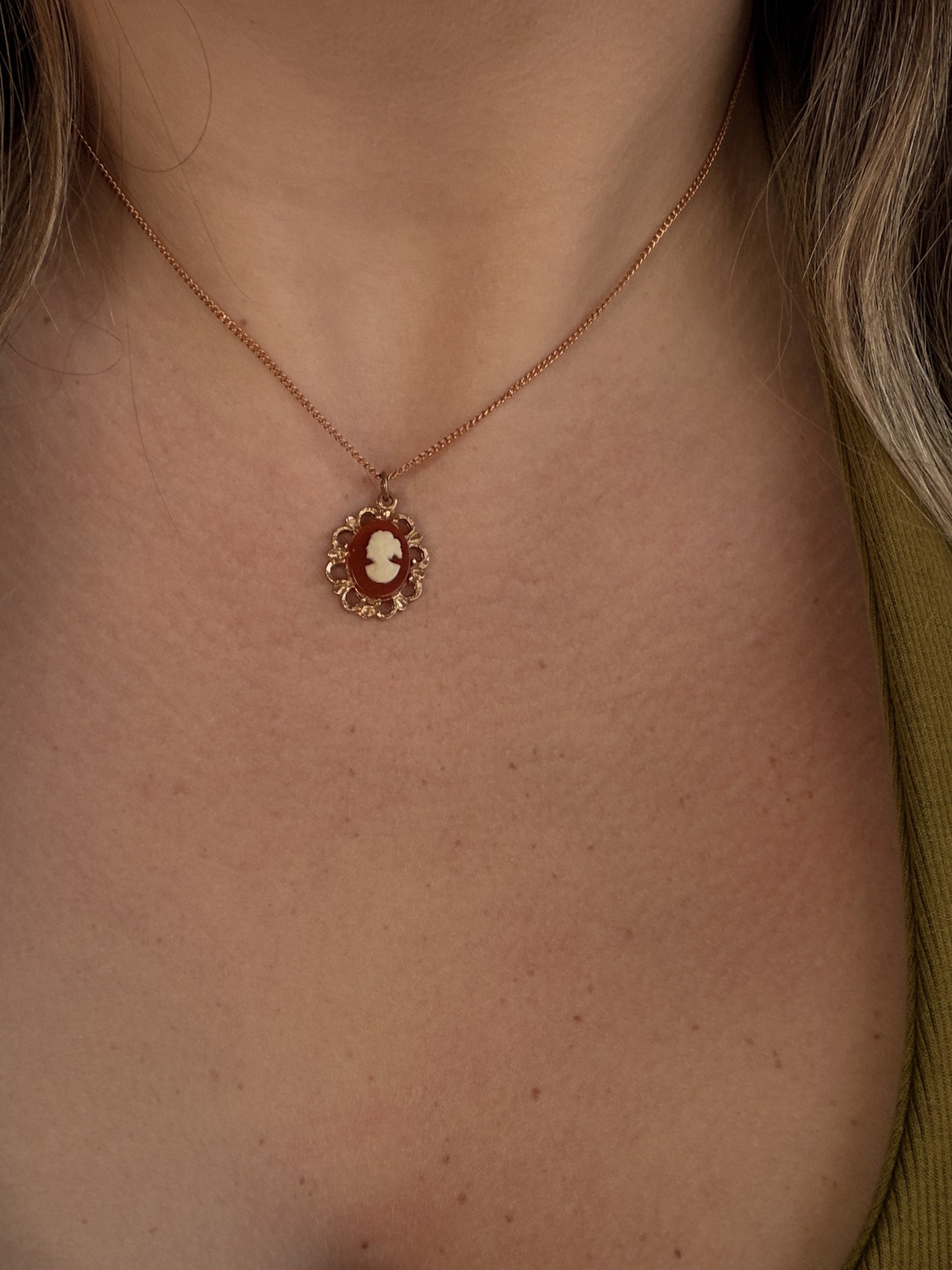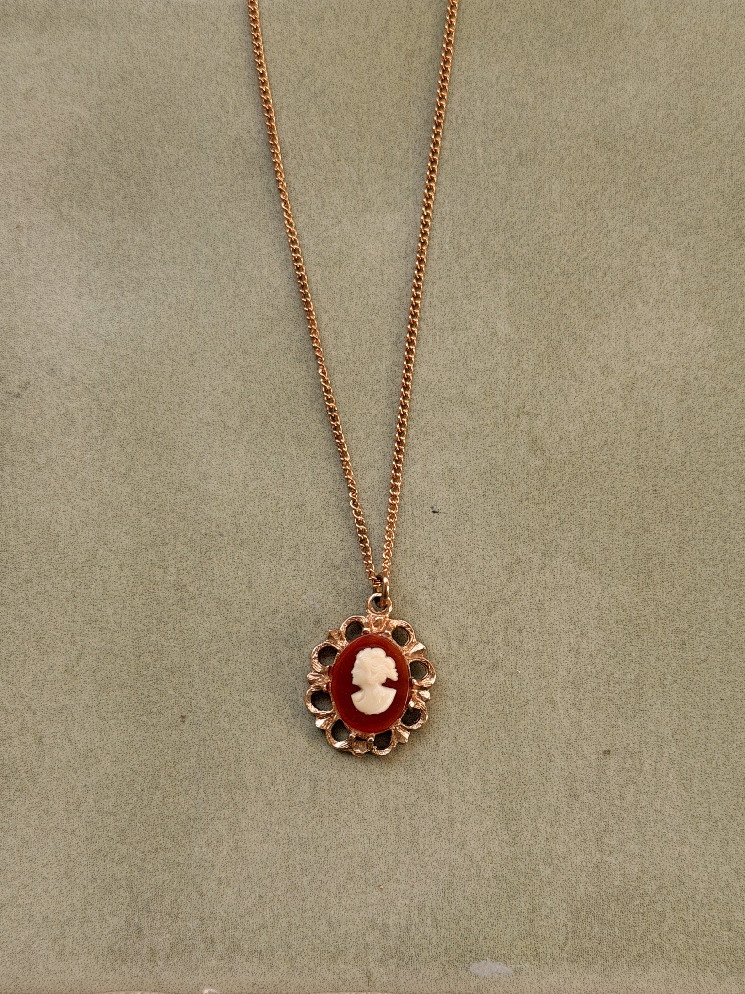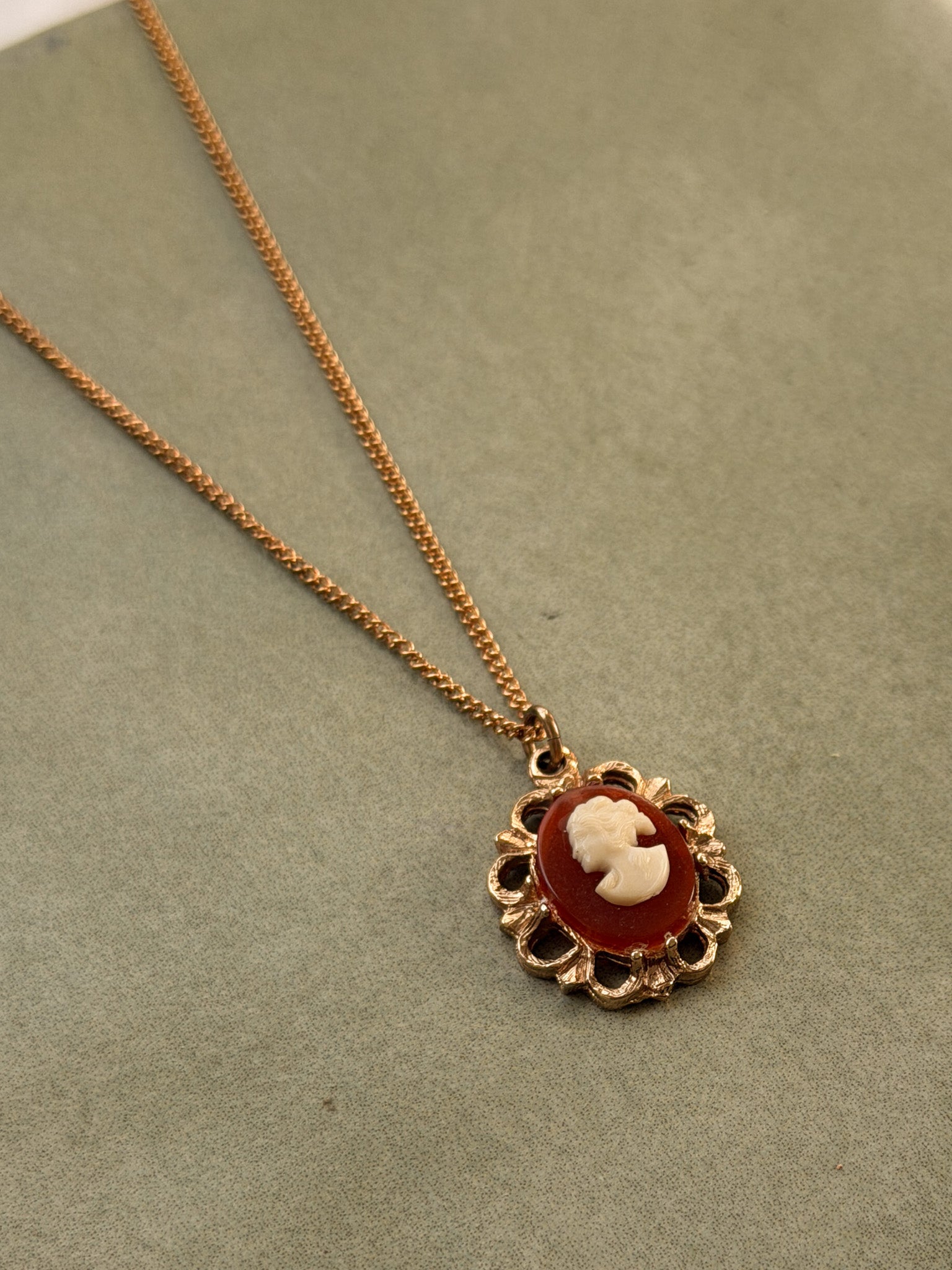 - vintage resin cameo from 1970's hanging on vintage gold chain (original chain in box)