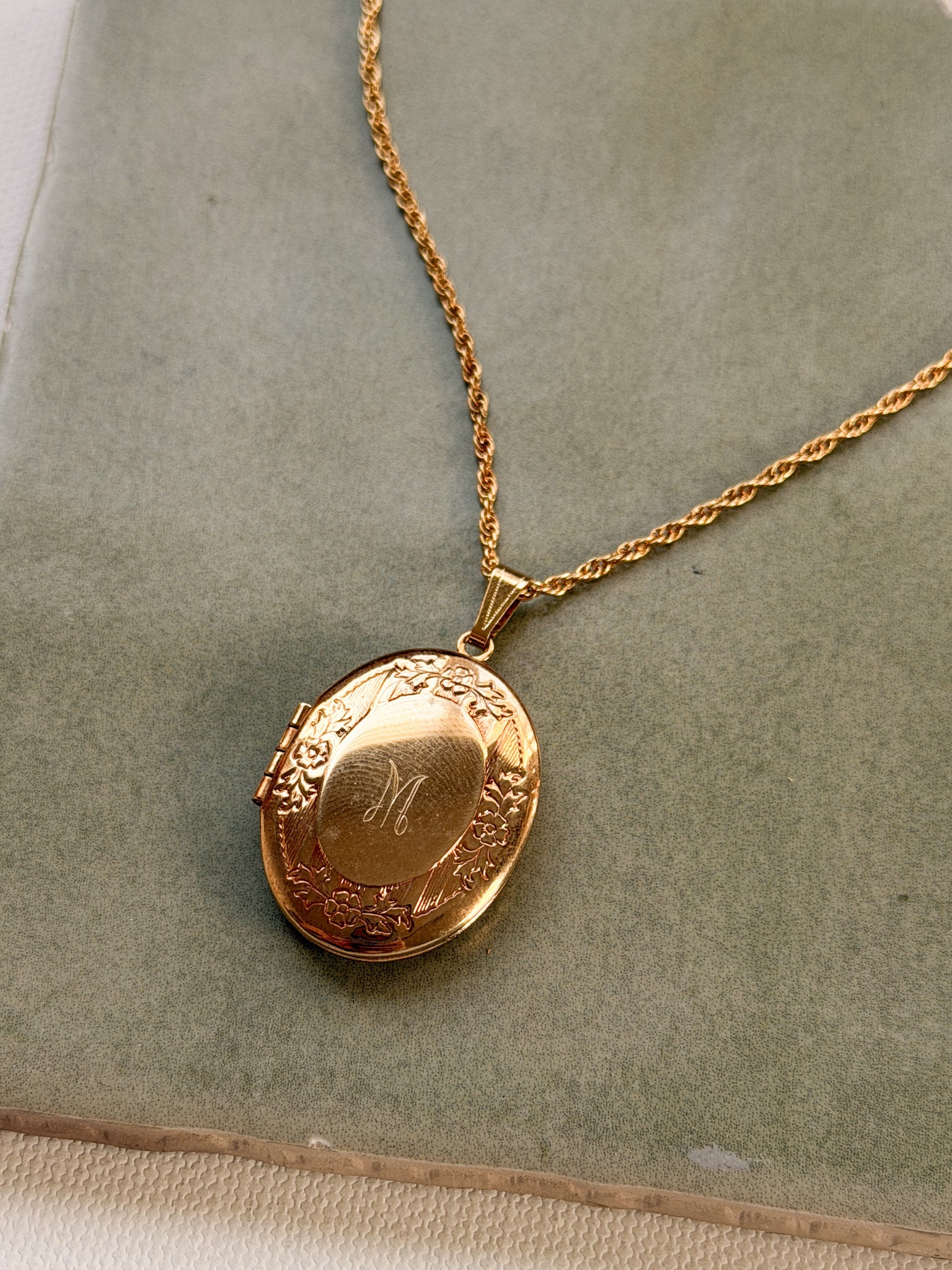 - vintage working locket (1") with 'M' etched hanging on gold electroplated rope chain